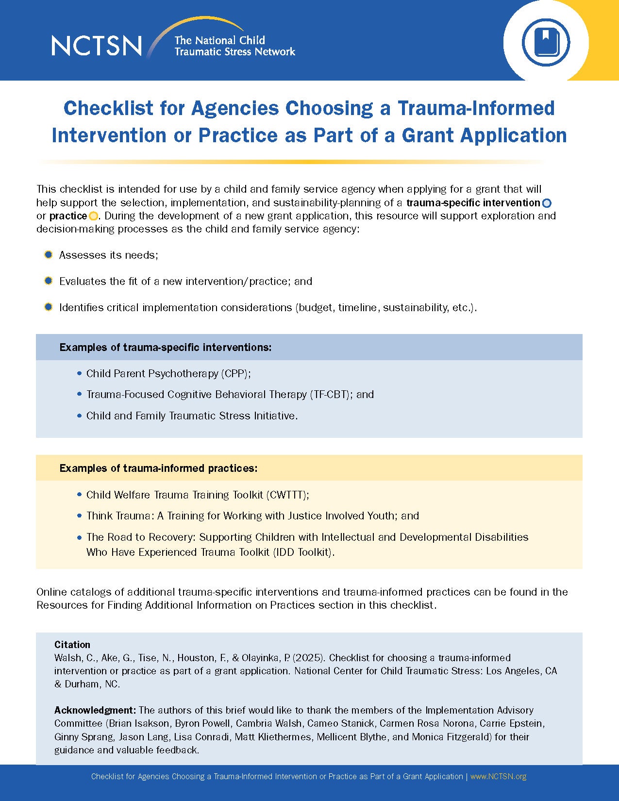 Checklist for Agencies Choosing a Trauma-Informed Intervention or Practice as Part of a Grant Application [1]