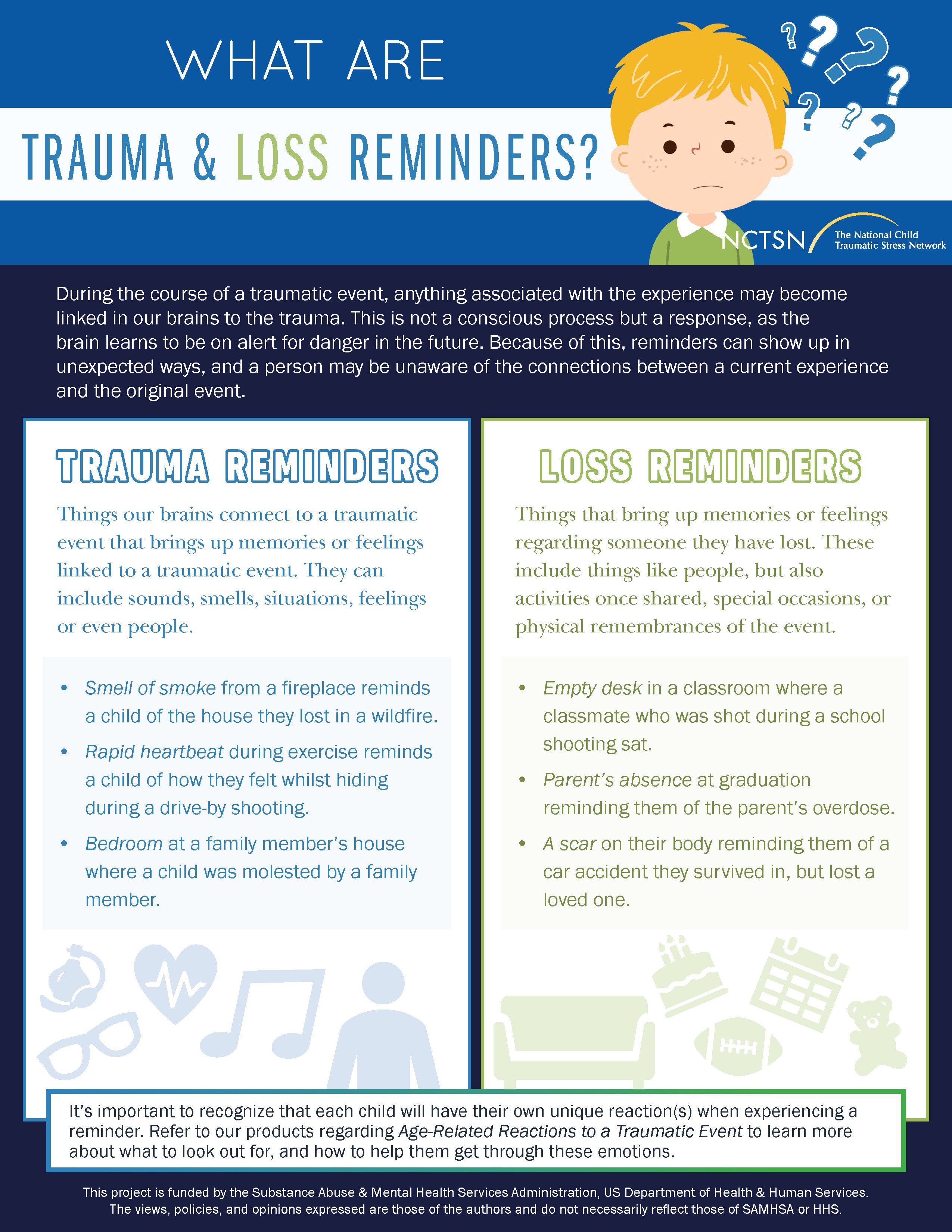 Explains how everyday sights, sounds, and experiences can unexpectedly trigger memories or emotions tied to trauma or loss. Helps caregivers understand these reminders and recognize how they may show up differently for each child.