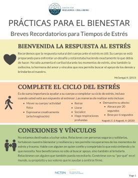 Amables recordatorios para tiempos de estrés: ofrece amables recordatorios de prácticas de bienestar en tiempos de estrés. Esta hoja informativa incluye información sobre la aceptación de la respuesta del cuerpo al estrés, completar el ciclo del estrés, conexión y relación, habilidades y prácticas emocionales, autoconciencia y atención.