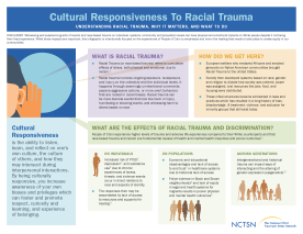 Offers mental health providers information on understanding cultural responsiveness to racial trauma, why it matters, and what to do. This infographic includes information on what is racial trauma, what is cultural responsiveness, how did we get here, what are the effects of racial trauma and discrimination, as well as your responsibility as a mental health provider.