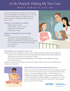 Offers parents guidance to parents about how to support your teen while at the hospital before, during, or after a medical procedure. This fact sheet, a part of the Pediatric Medical Traumatic Stress Toolkit for Health Care Providers, provides eight ways parents can support their teen during a hospital stay.