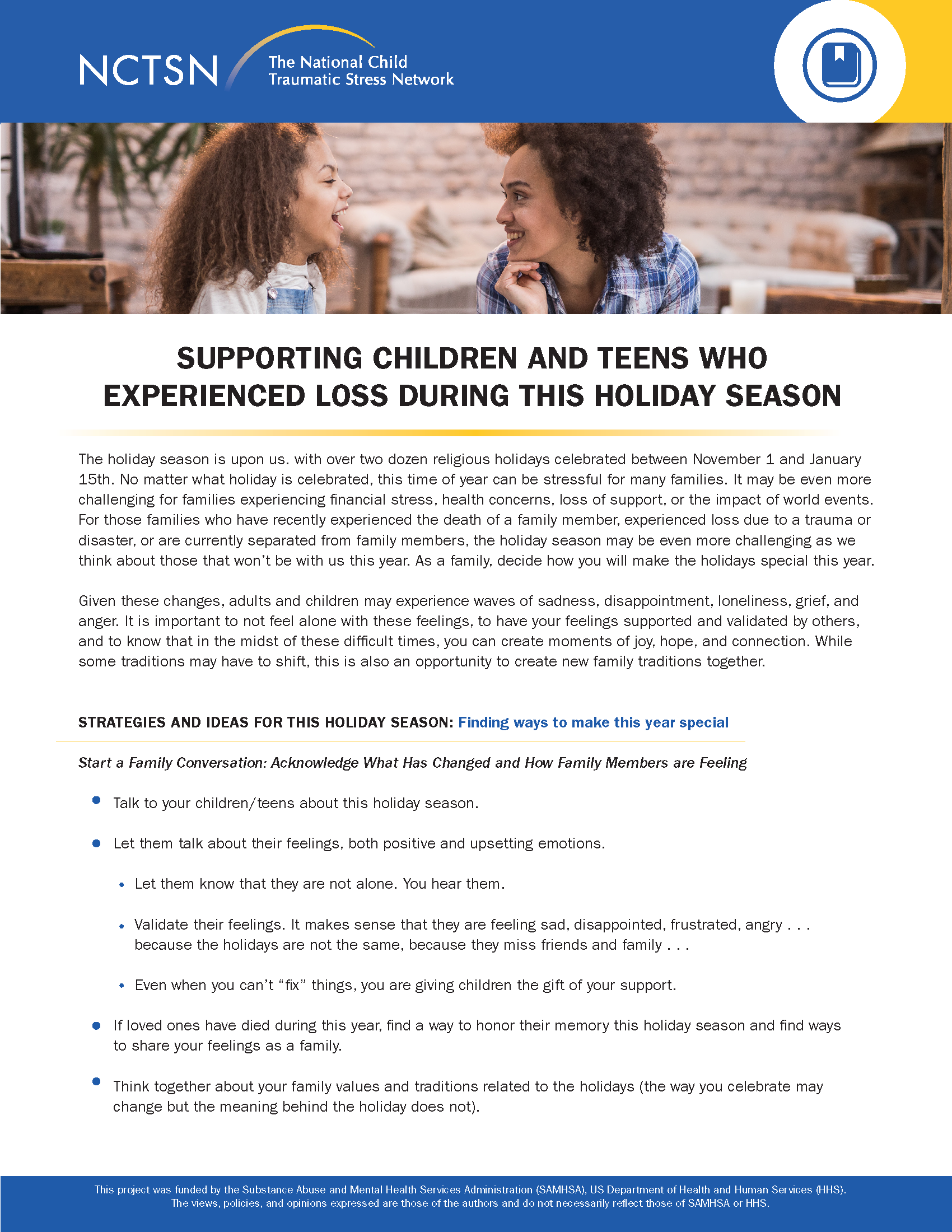 Offers parents and caregivers strategies and ideas for supporting children and teens during the holiday season. This fact sheet provides tips that parents can use to talk to their children and teens about how they are feeling and changes to holiday celebrations and traditions. It also shares tips that families can use to make this holiday season still feel special, including creative ways in which families can stay connected to loved ones and friends. Ideas for self-care and additional resources are also included in the fact sheet. Updated November 2025.