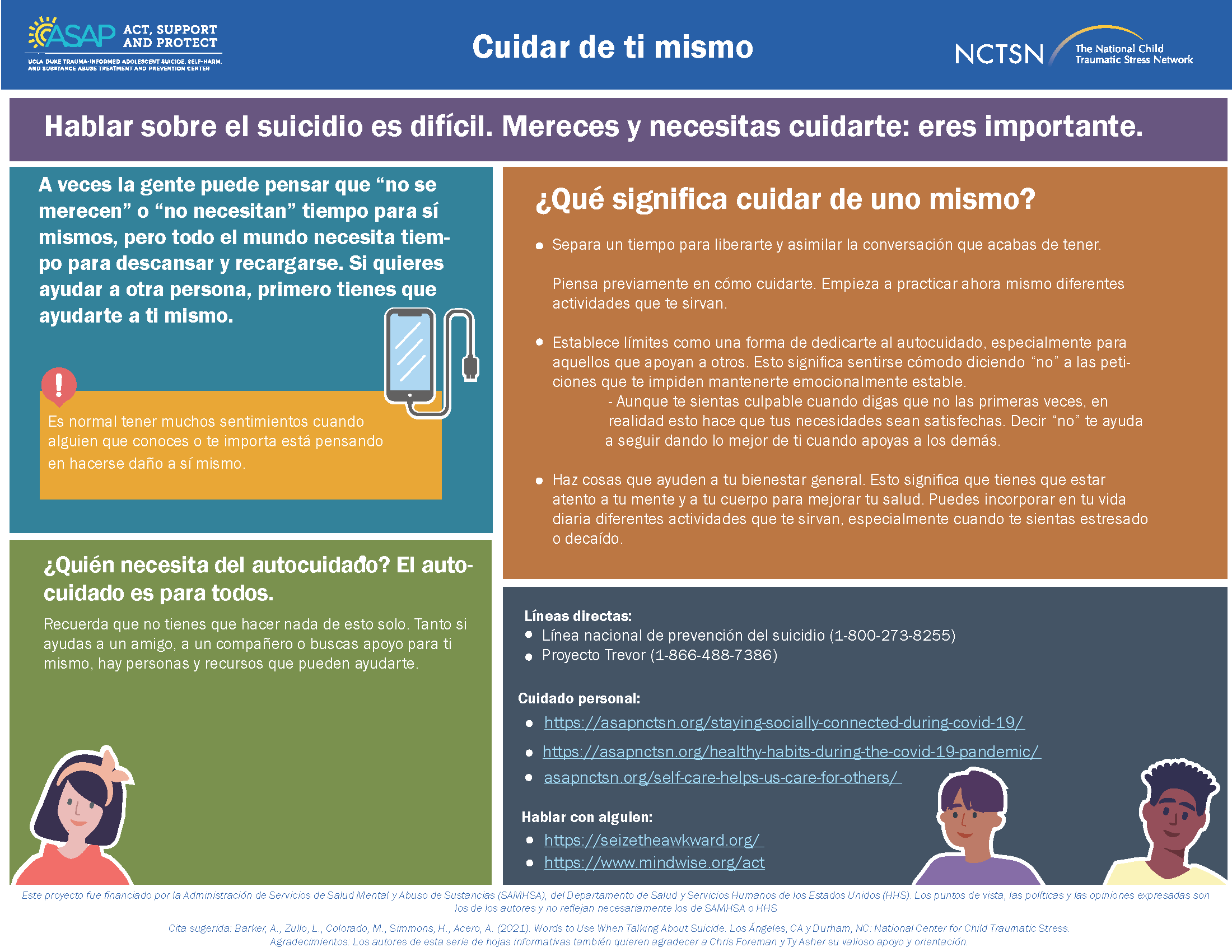 Cuidar de uno mismo: ofrece información para ayudar a los jóvenes a cuidarse a sí mismos. Esta hoja informativa incluye información sobre lo que significa cuidarse uno mismo, además de recomendaciones de líneas directas de ayuda y temas para estimular la conversación. Este recurso es de mayor utilidad para jóvenes de 12 años en adelante.Translated in 2022.
