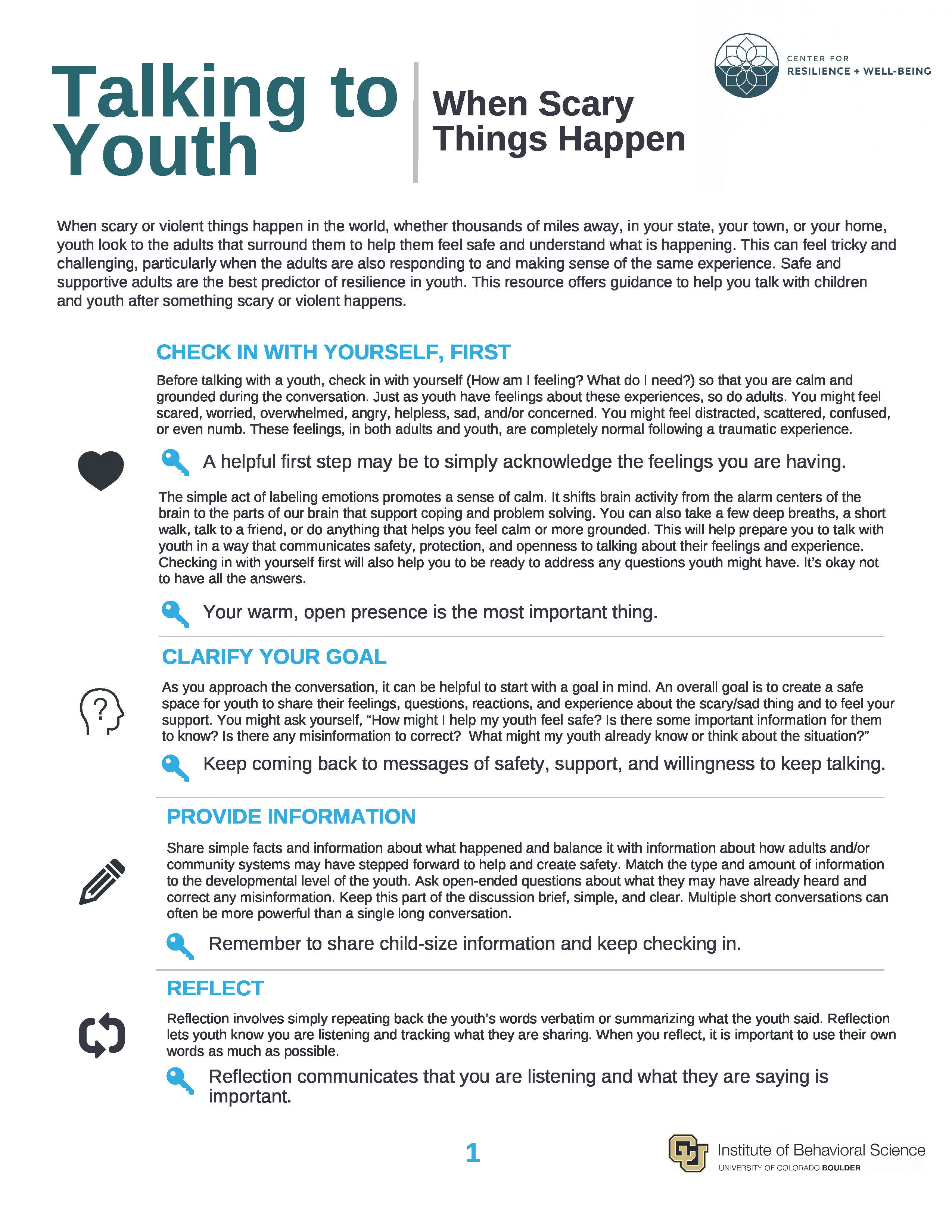 Offers guidance on talking with children and youth when scary things happen. This fact sheet includes information on checking in with yourself, clarifying your goal, providing information, reflecting, asking helpful questions, going slow, labeling emotions, validating, and reducing media exposure.